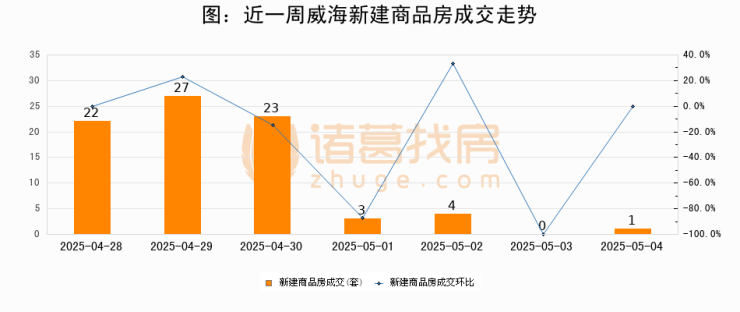 根据威海市住房和城乡建设局数据显示,2025年05月04日威海新建商品房成交1套,较昨日增加1套,环比上涨0%