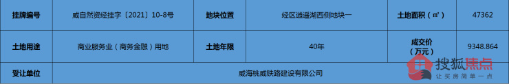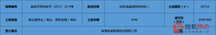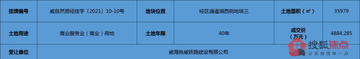 威自然资经挂字〔2021〕10-10号:由威海桃威铁路建设有限公司竞得,土地位于经区逍遥湖西侧地块三,出让面积为35979平方米,容积率0.6,成交价4884.285万元,楼面地价2263元/㎡。