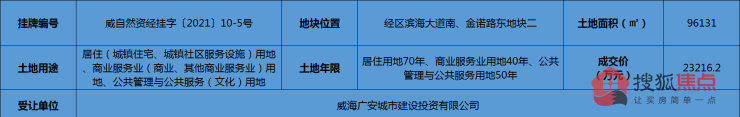 威自然资经挂字〔2021〕10-5号:由威海广安城市建设投资有限公司竞得,土地位于经区滨海大道南、金诺路东地块二,出让面积为96131平方米,容积率1.5,成交价23216.2万元,楼面地价1610元/㎡。
