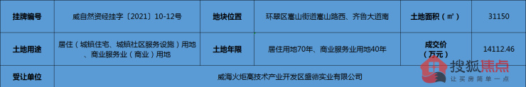威自然资经挂字〔2021〕10-12号:由威海火炬高技术产业开发区盛德实业有限公司竞得,地块位于环翠区嵩山街道嵩山路西、齐鲁大道南,出让面积为31150平方米,容积率1.9,成交价14112.46万元,楼面地价2384元/㎡。