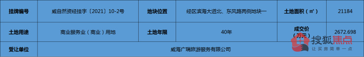 威自然资经挂字〔2021〕10-2号:由威海广瑞旅游服务有限公司竞得,土地位于经区滨海大道北、东风路两侧地块一,出让面积为21184平方米,容积率0.5,成交价2672.698万元,楼面地价2523元/㎡。