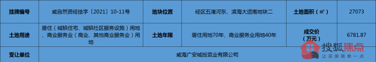 威自然资经挂字〔2021〕10-11号:由威海广安城投置业有限公司竞得,土地位于位于经区五渚河东、滨海大道南地块二,出让面积为27073平方米,容积率1.01,成交价6781.87万元,楼面地价2480元/㎡。