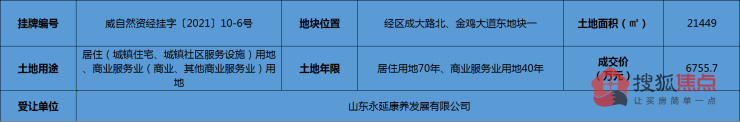 威自然资经挂字〔2021〕10-6号:由山东永延康养发展有限公司竞得,土地位于经区成大路北、金鸡大道东地块一,出让面积为21449平方米,容积率1.8,成交价6755.7万元,楼面地价1750元/㎡。