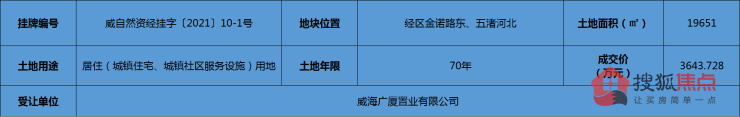 威自然资经挂字〔2021〕10-1号:由威海广厦置业有限公司竞得,土地位于经区金诺路东、五渚河北,出让面积为19651平方米,容积率1.2,成交价3643.728万元,楼面地价1545元/㎡。
