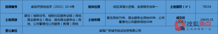 威自然资经挂字〔2021〕10-4号:由威海广安城市建设投资有限公司竞得,土地位于位于经区滨海大道南、金诺路东地块一,出让面积为78524平方米,容积率1.5,成交价19435.35万元,楼面地价1650元/㎡。