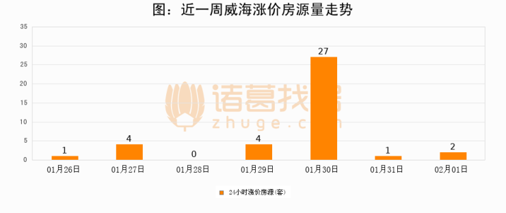 根据诸葛找房数据显示,威海24小时涨价房源量为2套,较01月31日增加1套,环比上涨100%。与此同时,涨价房源占比小幅扩大,业主信心有所提升。