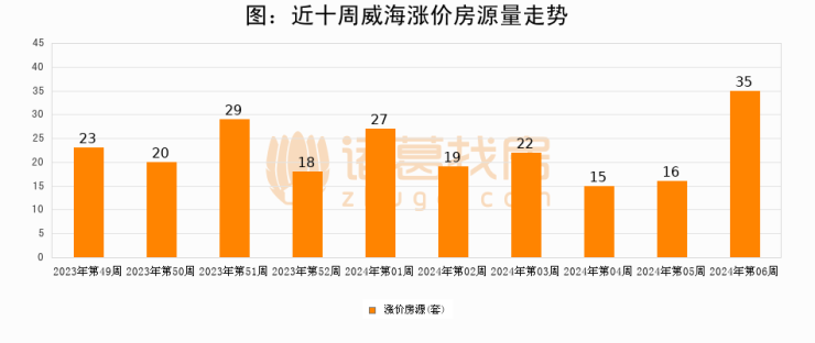 从调价房源来看,第5周威海涨价房源35套,较上周上涨118.8%。与此同时,5周涨价房源占比提升18.99个百分点,业主信心持续恢复。