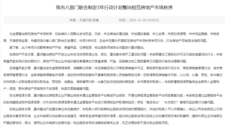 11月30日,天津市住房城乡建设委、市发展改革委、市公安局、市规划资源局、市市场监管委、市税务局、天津银保监局、市委网信办等八部门联合印发通知,利用3年时间,在全市范围内开展规范房地产市场秩序专项行动,打击房地产领域违法违规问题。