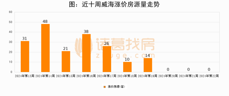 从调价房源来看,第22周威海涨价房源0套,较上周持平。与此同时,22周涨价房源占比持平