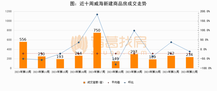 进入2024年第22周(05月27日-06月02日),威海新建商品房成交234套,较上周减少28套,环比下降10.7%