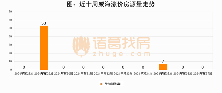 从调价房源来看,第37周威海涨价房源0套,较上周持平。与此同时,37周涨价房源占比持平