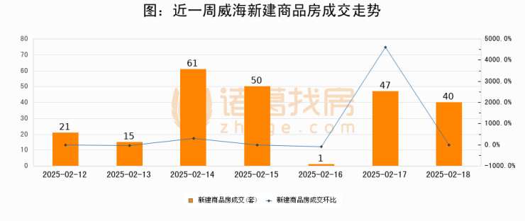 根据威海市住房和城乡建设局数据显示,2025年02月18日威海新建商品房成交40套,较昨日减少7套,环比下降14.9%。近一周威海新建商品房日均成交34套。02月18日单日成交40套,高于近一周平均水平17.6%。