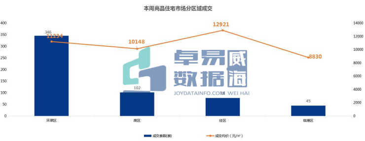 从区域来看,本周威海环翠区在成交面积和套数方面高于其他三个区,成交346套,占比60%,成交面积39704㎡,均价11234元/平;成交均价则经区较高,均价12921元/平。