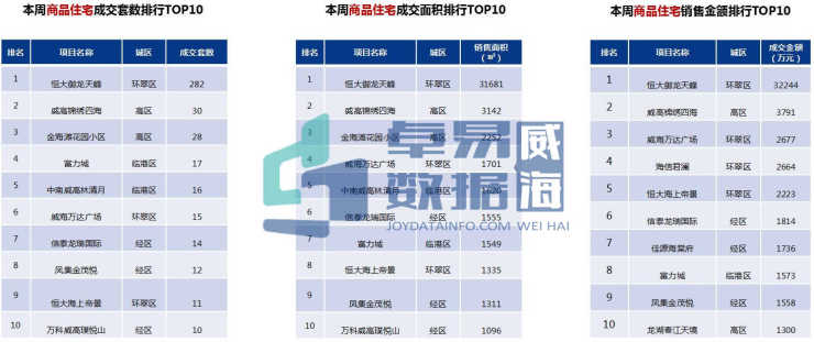 本周项目成交TOP10各区分散成交,环翠区恒大御龙天峰项目和高区锦绣四海项目本周在成交套数、成交面积、成交总金额排行榜上均位列前二。