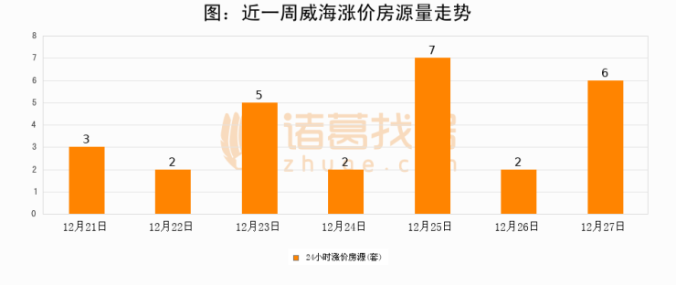 根据诸葛找房数据显示,威海24小时涨价房源量为6套,较12月26日增加4套,环比上涨200%。与此同时,涨价房源占比小幅扩大,业主信心有所提升。