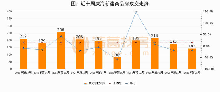 进入2025年第22周(05月26日-06月01日),威海新建商品房成交143套,较上周减少32套,环比下降18.3%