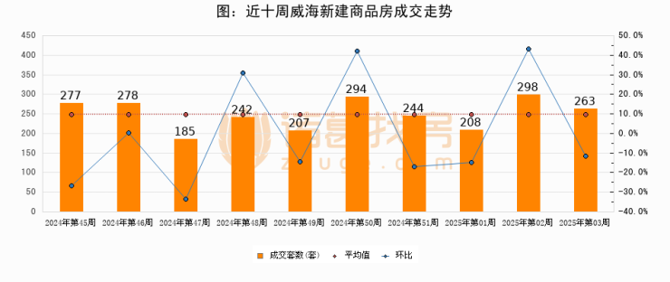 进入2025年第03周(01月13日-01月19日),威海新建商品房成交263套,较上周减少35套,环比下降11.7%