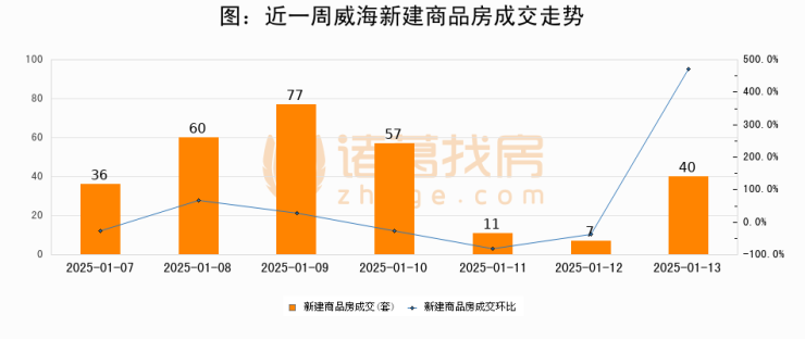 根据威海市住房和城乡建设局数据显示,2025年01月13日威海新建商品房成交40套,较昨日增加33套,环比上涨471.4%。近一周威海新建商品房日均成交42套。01月13日单日成交40套,低于近一周平均水平4.8%。