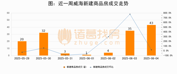 根据威海市住房和城乡建设局数据显示,2025年06月04日威海新建商品房成交43套,较昨日增加8套,环比上涨22.9%