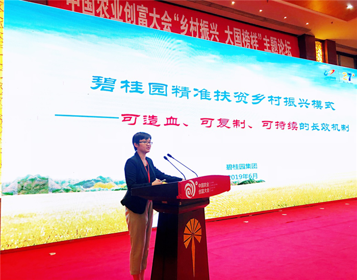 在“乡村振兴•大国榜样”主题论坛上,碧桂园集团党群社责部公共事务总监朱泳婷女士分享碧桂园精准扶贫乡村振兴模式