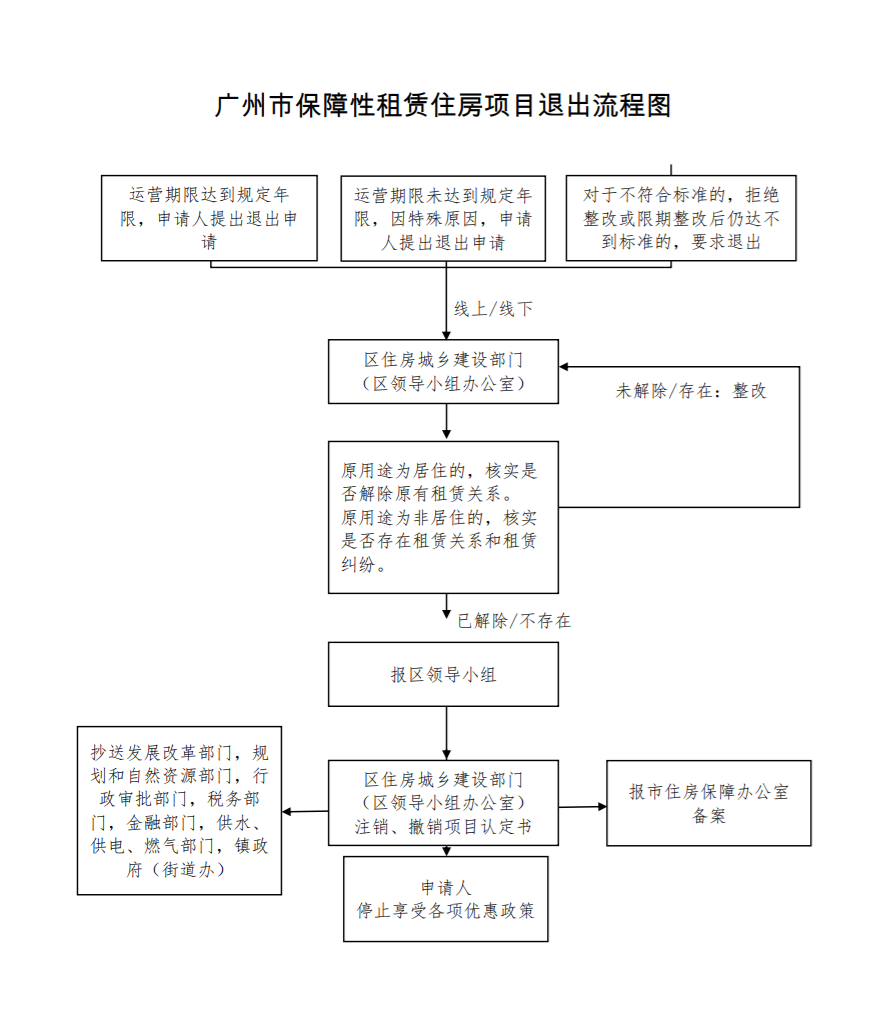 对于不符合标准的,拒绝整改或限期整改后仍达不到标准的保障性租赁住房项目;或运营期限未达到规定年限,因破产清算、征收拆迁等其他原因确需退出的保障性租赁住房项目,广州住房城乡建设部门将撤销项目认定书。