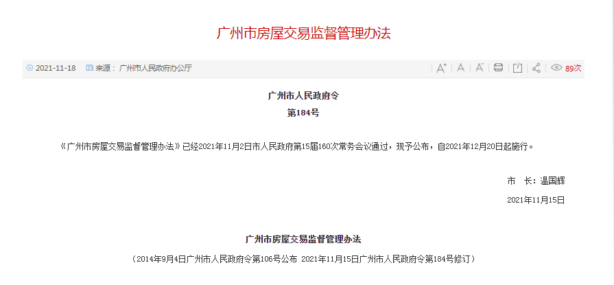11月18日,广州市人民政府发布《广州市房屋交易监督管理办法》(以下简称《办法》)。