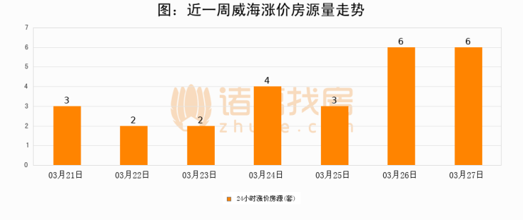 根据诸葛找房数据显示,威海24小时涨价房源量为6套,较03月26日持平。