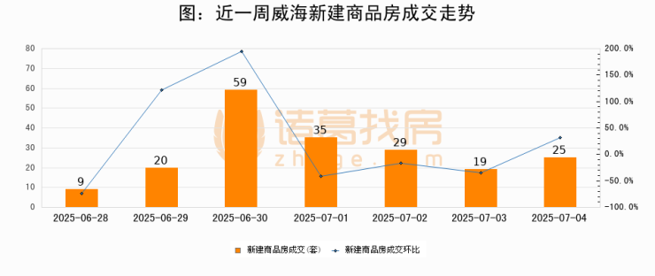根据威海市住房和城乡建设局数据显示,2025年07月04日威海新建商品房成交25套,较昨日增加6套,环比上涨31.6%