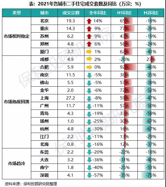 据保利投顾研究院监测,2021年21城二手住宅成交套数141万宗、成交面积1.3万亿㎡,交易规模不及前两年,成交套数较2020年和2019年分别下滑8%和4%。