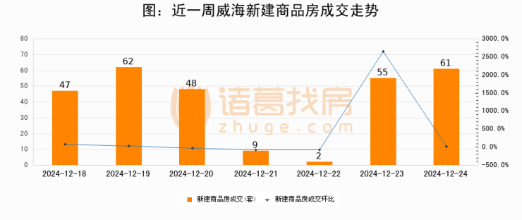 根据威海市住房和城乡建设局数据显示,2024年12月24日威海新建商品房成交61套,较昨日增加6套,环比上涨10.9%