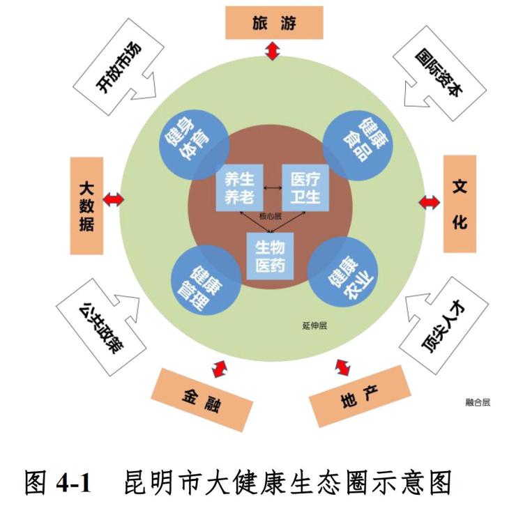 为了实现这一系列的任务目标,昆明结合自身资源优势,提出了以“医、药、养”为核心,以“健、食、农、管”为延伸,融合旅游、文化、大数据、金融、房地产等行业领域,打造六条特色产业链的生态圈构建措施。通过推进建设健康旅游、健康文化、健康数据、健康金融以及健康社区,将大健康相关理念贯穿深入整体产业发展过程中。