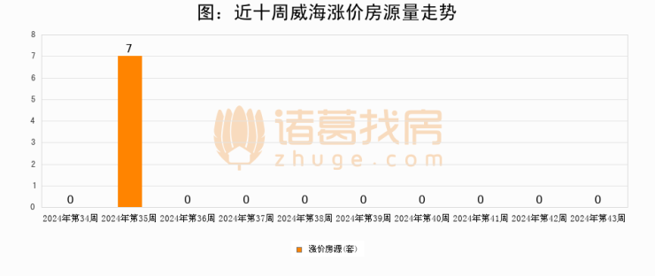 从调价房源来看,第43周威海涨价房源0套,较上周持平。与此同时,43周涨价房源占比持平