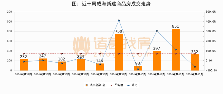 进入2024年第43周(10月21日-10月27日),威海新建商品房成交332套,较上周减少519套,环比下降61%