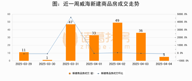 根据威海市住房和城乡建设局数据显示,2025年04月04日威海新建商品房成交5套,较昨日减少31套,环比下降86.1%。近一周威海新建商品房日均成交26套。04月04日单日成交5套,低于近一周平均水平80.8%。