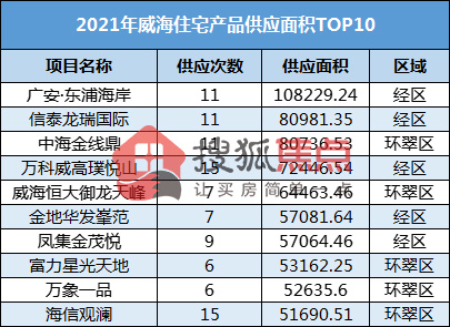据统计,2021年度威海住宅项目供应前十分别是广安·东浦海岸、信泰龙瑞国际、中海金线鼎、万科威高璞悦山、威海恒大御龙天峰、金地华发峯范、凤集金茂悦、富力星光天地、万象一品、海信观澜。榜单中聚集了中海、万科、海信、金地等品牌开发商,与此同时,区域分布主要集中在经区及环翠区,位于经区的广安·东浦海岸供应面积约10.8万平位居榜单排名前列位。