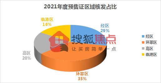 分区域来看,2021年预售证核发数量中环翠区数量最多,全年核发112张预售证,占比35%;其次是经区,全年核发90张,占比29%;高区全年核发64张预售证,占比20%;而临港区由于新开发落地项目较少,所以获证项目和获证数量都较少,全年核发数量仅50张,占比16%,处于垫底位置。