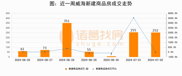 根据威海市住房和城乡建设局数据显示,2024年07月02日威海新建商品房成交252套,较昨日减少3套,环比下降1.2%。近一周威海新建商品房日均成交151套。07月02日单日成交252套,高于近一周平均水平66.9%。