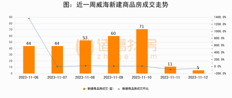 根据威海市住房和城乡建设局数据显示,2023年11月12日威海新建商品房成交5套,较昨日减少6套,环比下降54.5%