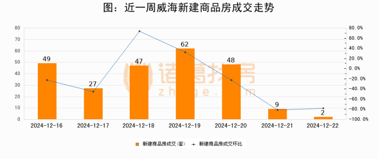 根据威海市住房和城乡建设局数据显示,2024年12月22日威海新建商品房成交2套,较昨日减少7套,环比下降77.8%