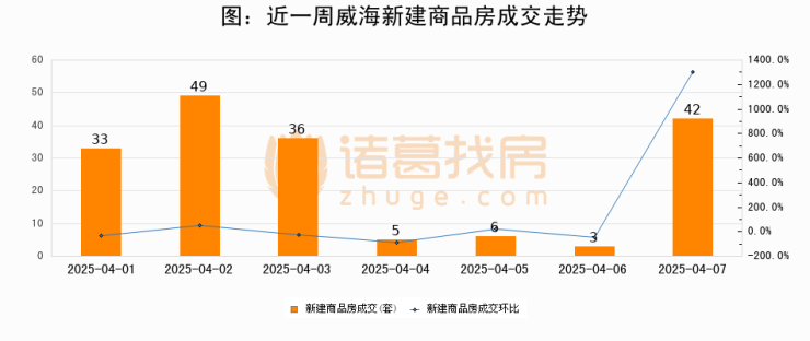 根据威海市住房和城乡建设局数据显示,2025年04月07日威海新建商品房成交42套,较昨日增加39套,环比上涨1300%