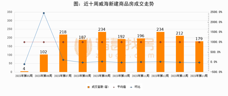 进入2025年第14周(03月31日-04月06日),威海新建商品房成交179套,较上周减少33套,环比下降15.6%