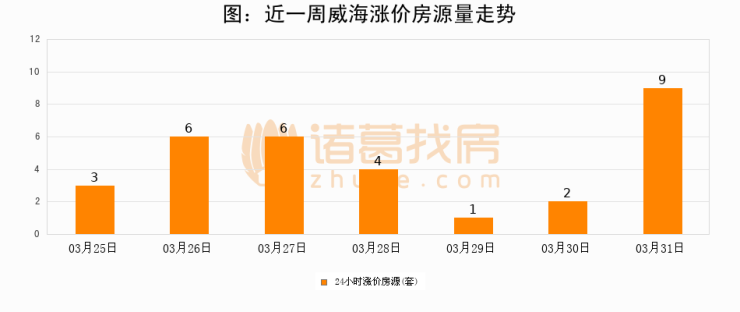 根据诸葛找房数据显示,威海24小时涨价房源量为9套,较03月30日增加7套,环比上涨350%。与此同时,涨价房源占比小幅扩大,业主信心有所提升。