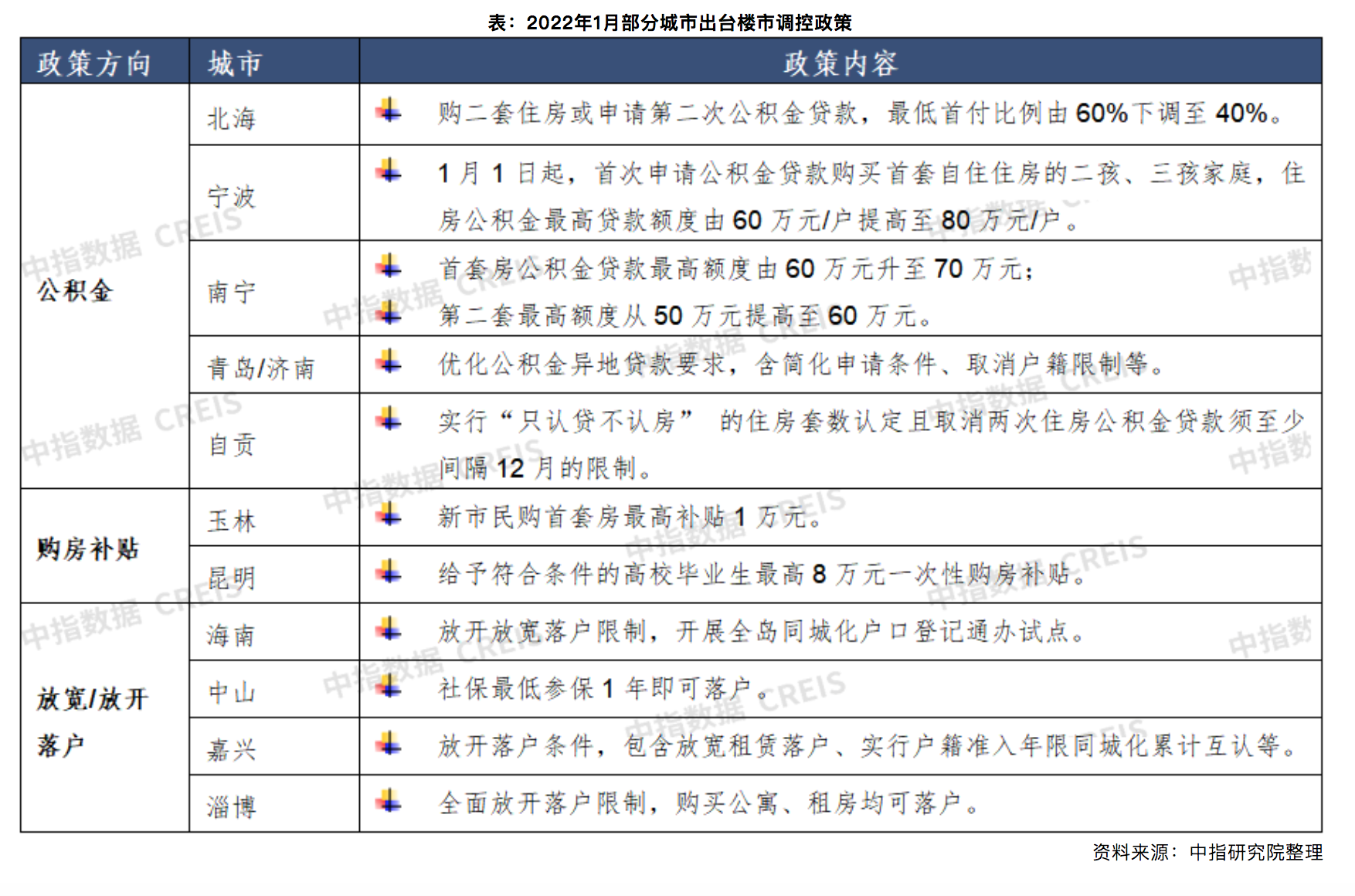 从成交规模来看,中指研究院报告显示,全国市场整体仍较为低迷。新建住宅方面,重点城市整体推盘量有所回落,1月除上海新房市场成交规模有所回升外,多数城市市场表现较为冷清,且部分项目经历去年底优惠促销、以价换量后,1月价格优惠力度减弱。二手住宅方面,市场整体维持冷淡态势,除杭州、北京二手房成交量有所企稳外,其它多数城市二手房成交量依然维持低位运行。分城市群看,2022年1月,京津冀及珠三角新建住宅价格环比微涨。京津冀新房价格环比微涨0.05%,区域内北京受部分高于城市均价项目入市带动,房价环比止跌转涨;张家口新房价格结束连跌态势,环比微幅上涨。珠三角新房价格环比上涨0.01%,涨幅较上月收窄0.04个百分点。山东半岛及长三角新建住宅价格继续下跌。1月山东半岛新房价格环比下跌0.01%,济南、青岛新房市场依旧保持低迷态势。长三角新房价格环比下跌0.03%,跌幅较上月扩大0.02个百分点,区域内共11个城市价格环比出现下跌,上海受部分低于城市均价项目入市带动房价结构性下跌。可以看到的是,在市场整体趋冷的背景下,2022年开年房地产调控延续去年四季度政策方向,各地频繁出台新政纾困楼市。中指研究院报告显示,2022年1月,中央及地方房地产政策环境持续改善。全国住房和城乡建设工作会议召开,强调保持调控政策连续性稳定性,增强调控政策协调性精准性;国家发改委强调支持商品房市场更好满足购房者的合理住房需求,促进住房消费健康发展;随后全国银行间同业拆借中心公布5年期以上贷款市场报价利率(LPR)下调5个基点。