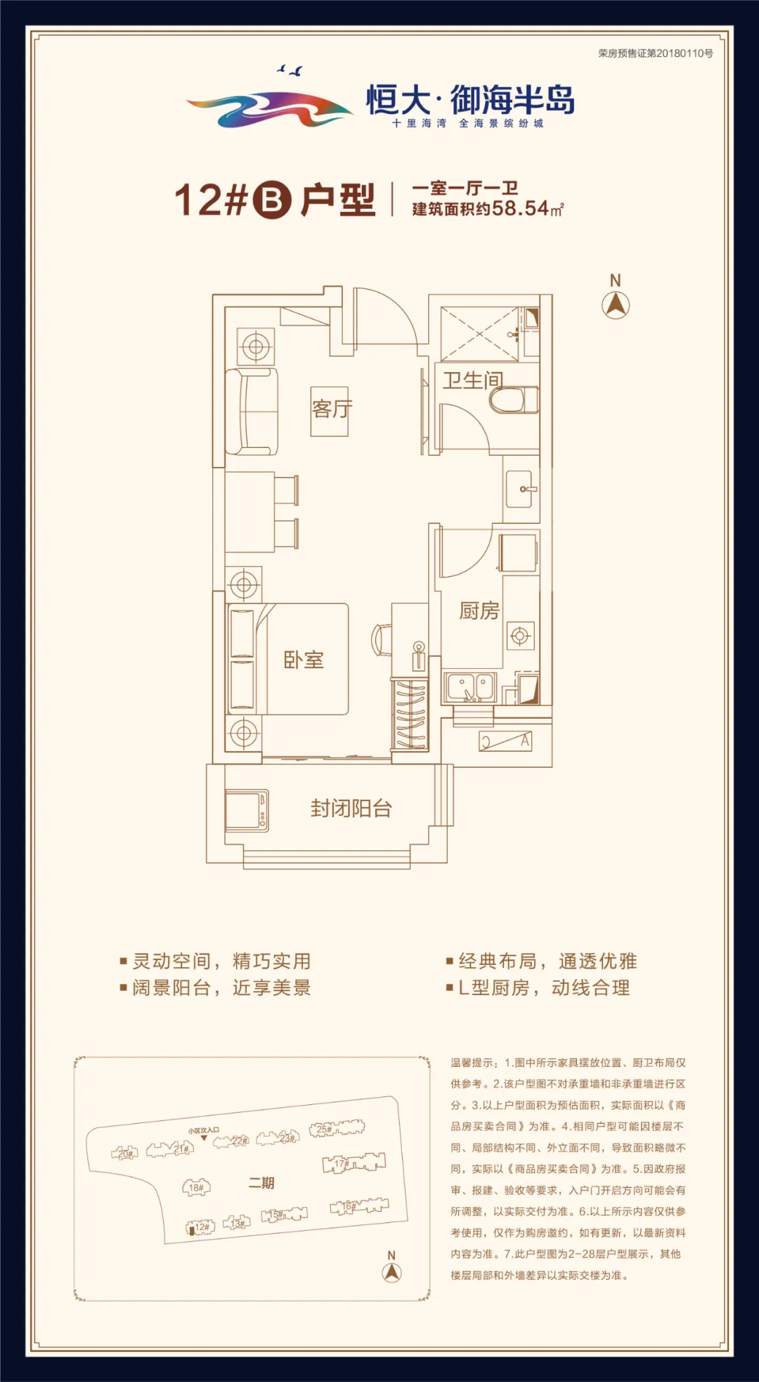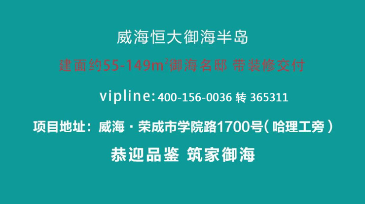 温馨提示:1、预售证号:荣房预售证第20180110号;2、标准地名: 恒大御海半岛;3、本项目注册名为恒大御海半岛,推广名为威海恒大御海半岛,商品房楼号、房号由政府有关部门初步确定,项目最终名称及商品房楼号、房号以政府相关文件确认为准;4、本资料相关内容、图片是对项目所做的示意表现,仅供参考,楼盘规划、配套等情况,最终以政府有关部门批准的文件、图则为准;经政府批准的详细规划已在楼盘销售现场公示,敬请查看;后续因规划设计方案调整导致信息变化的内容,我司将按照政府要求进行公示;5、本资料为要约邀请,买卖双方的权利及义务以双方签订的《商品房买卖合同》为准;6、分期付款政策说明:选择分期付款政策的客户,在签署认购书后5天内付楼款20%以上并签署《商品房买卖合同》,剩余房款须在签署认购书后按《楼宇认购书》或《商品房买卖合同》规定支付。部分楼盘无分期付款政策,详询各售楼部;7、本广告对项目的周围道路规划、环境、交通、公共设施、各种产品及文字介绍,旨在提供相关信息,不意味着本公司对此作出了任何承诺;8、本项目的教育配套以政府规划为准,可能会存在教育资源差额分配的情况,业主是否符合入读条件,具体以政府文件为准。教育机构的开业招生时间可能受政府或政府指定的经营方要求所限,此情况下以政府或政府指定的经营方要求为准;9、本次楼盘优惠详情请咨询当地销售中心,具体价格以实际成交价格为准;10、本广告相关面积段均为预估建筑面积,具体面积以签署《商品房买卖合同》为准;11、本文部分配图来源于网络,相关版权归原作者所有,如有侵权,请联系我们删除;12、本广告2021年7月启用,相关内容如有更新,请以较新资料内容为准。