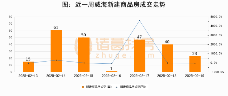 根据威海市住房和城乡建设局数据显示,2025年02月19日威海新建商品房成交23套,较昨日减少17套,环比下降42.5%。近一周威海新建商品房日均成交34套。02月19日单日成交23套,低于近一周平均水平32.4%。