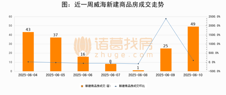 根据威海市住房和城乡建设局数据显示,2025年06月10日威海新建商品房成交49套,较昨日增加24套,环比上涨96%