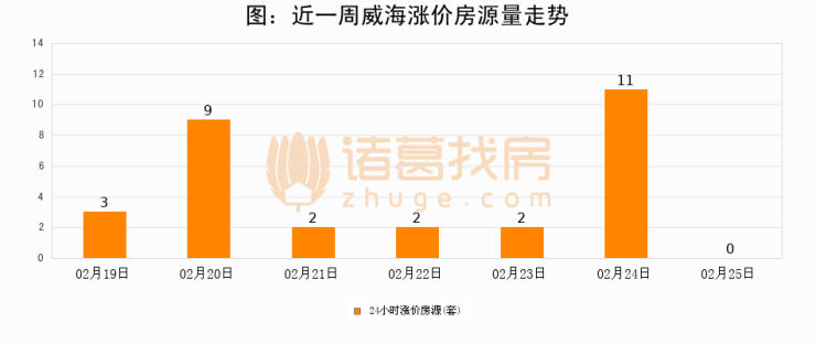 根据诸葛找房数据显示,威海24小时涨价房源量为0套,较02月24日减少11套,环比下降100%。与此同时,涨价房源占比小幅回落,对于购房者来说是一个入市窗口期,购房者可抓住时机入市。