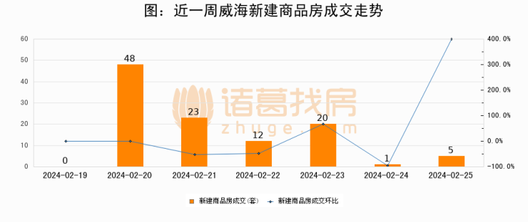 根据威海市住房和城乡建设局数据显示,2024年02月25日威海新建商品房成交5套,较昨日增加4套,环比上涨400%