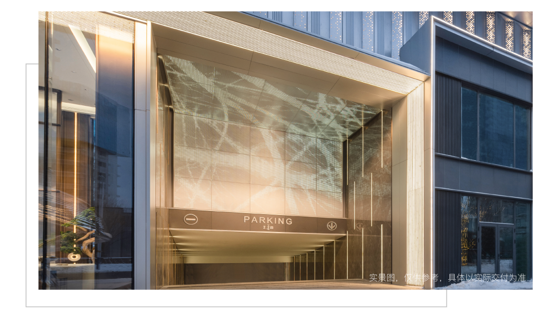 车库内部高吊顶设计,即便是类似奔驰GLS、宝马X7等大型SUV豪车,也不显得局促和拥挤,塑造从容、尊崇的泊车感受。车库整体建筑风格形成质感与线条的有机统一,既造就时尚简洁、轻奢亮丽的建筑特色,又能让空间通透无阂,让视线实现延伸,满足“玩车一族”挑剔的眼光。