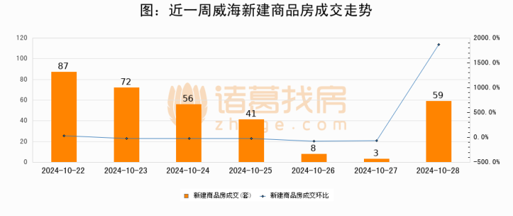 根据威海市住房和城乡建设局数据显示,2024年10月28日威海新建商品房成交59套,较昨日增加56套,环比上涨1866.7%